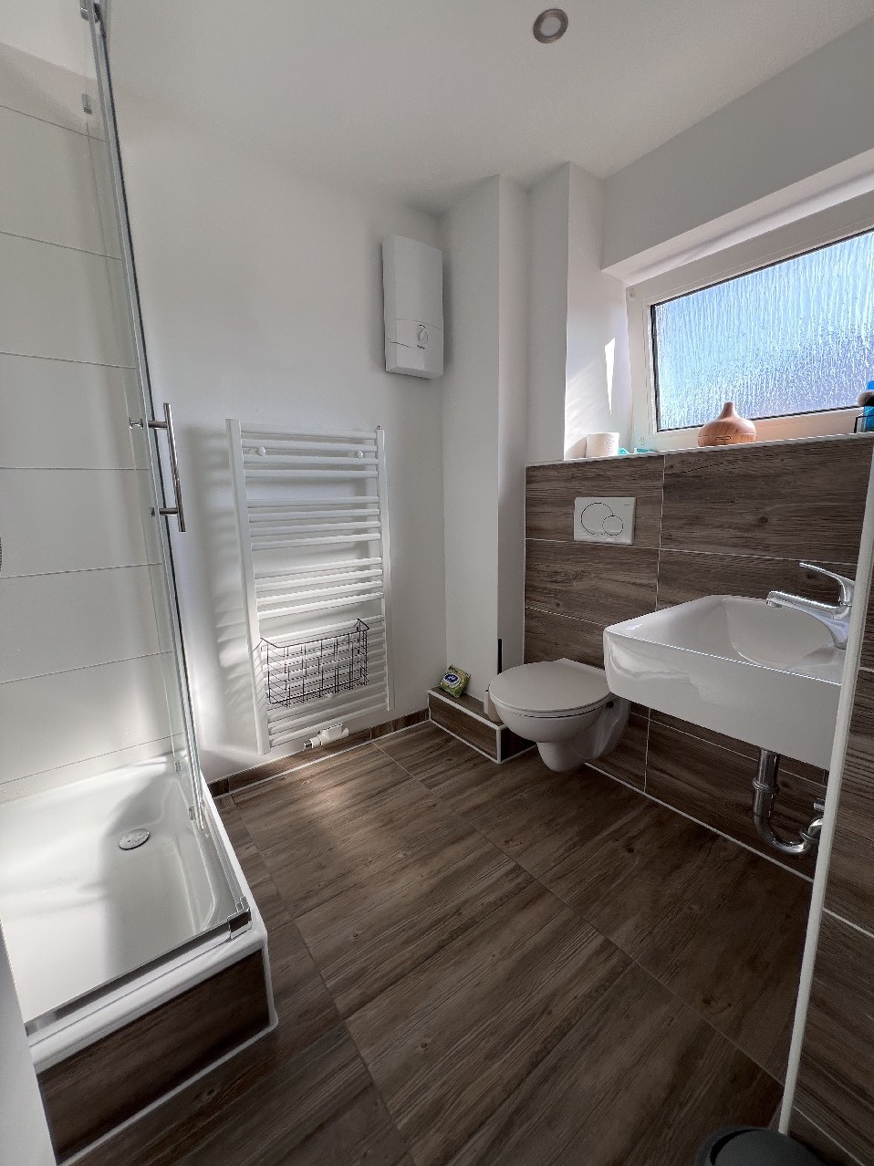 - Badausstattung: Dusche, Badewanne, Fenster im Badezimmer